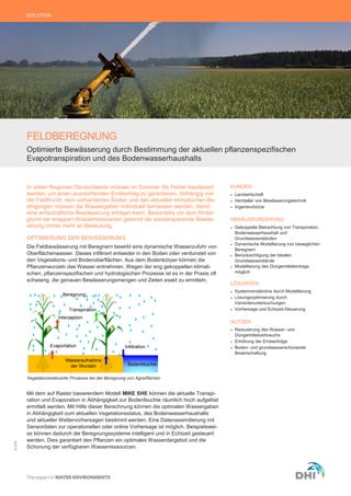 Das Dokument beschreibt eine optimierte Bewässerungsmethode für landwirtschaftliche Flächen in Deutschland unter Berücksichtigung der spezifischen Evapotranspiration und des Bodenwasserhaushalts. Mit einem auf dem Modell Mike SHE basierenden Ansatz wird die Wasserversorgung für Pflanzen dynamisch und in Echtzeit gesteuert, was zu einer Reduzierung des Wasser- und Düngemittelverbrauchs sowie einer Ertragssteigerung führt. Die Methodik ermöglicht eine präzise Berechnung der aktuellen Bewässerungsbedarfe und berücksichtigt klimatische sowie bodenspezifische Faktoren.