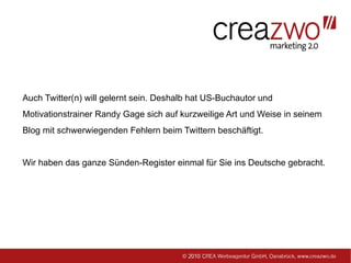 Der Blog von Randy Gage beschreibt die zehn größten Fehler beim Twittern, darunter das Veröffentlichen bedeutungsloser Tweets, das Versenden öffentlicher statt privater Nachrichten und das wiederholte Posten derselben Inhalte. Weitere Punkte sind das Kopieren von Tweets ohne Quellenangabe, das Betreiben anonymer Accounts und das Vernachlässigen der Interaktion mit Followern. Gage empfiehlt, Twitter als Plattform für Dialog und wertvolle Inhalte zu nutzen und die Nutzung von kurzen URLs zu fördern.