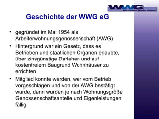 Die WWG wurde 1954 gegründet, um durch zinsgünstige Darlehen Wohnraum zu schaffen, und hat seitdem zahlreiche Wohnprojekte realisiert, darunter 1.100 Wohnungen im Stadtgebiet Burgbreite. Die Genossenschaft sieht sich aktuellen Herausforderungen durch demografische Veränderungen und steigende gesetzliche Anforderungen gegenüber, besonders hinsichtlich der Anpassung bestehender Wohnungen für ältere Mitglieder. Zukünftig soll durch attraktive Wohnungsangebote und umfassende Beratungsdienstleistungen der Verbleib in der eigenen Wohnung gefördert werden.