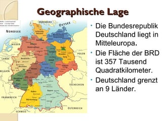 Die Bundesrepublik Deutschland liegt in Mitteleuropa und erstreckt sich über 357.000 Quadratkilometer. Sie grenzt an neun Länder, hat 16 Bundesländer mit eigenen Hauptstädten und ist bekannt für ihr mildes Klima, ihre malerischen Landschaften und bedeutenden Flüsse. Zu den natürlichen Sehenswürdigkeiten gehört die Zugspitze, der höchste Berg Deutschlands, sowie zahlreiche Wälder, Felder und Seen.