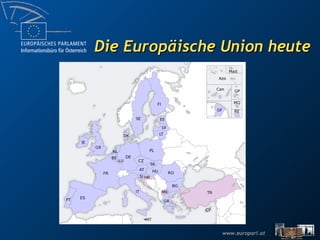 Die Präsentation über die Europäische Union beschreibt deren Geschichte, Institutionen und Mitgliedstaaten sowie die Kriterien für den EU-Beitritt. Sie hebt die Rolle wichtiger Verträge wie den Vertrag von Maastricht und den Vertrag von Lissabon hervor und informiert über die Struktur der EU, einschließlich der Europäischen Kommission, des Europäischen Parlaments und des Rates der EU. Zudem werden die Vorteile des Euro und der EU-Haushalt 2008 thematisiert.
