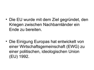 Die europäische Union wurde gegründet, um Frieden und politische Stabilität zwischen Nachbarländern zu fördern, und entwickelte sich von einer Wirtschaftsgemeinschaft zu einer politischen Union seit 1992. Die EU hat von ihrer Gründung 1951 bis zur letzten Erweiterung 2007 mehrere Länder aufgenommen, mit mehreren zukünftigen Beitrittskandidaten, darunter die Türkei und Kroatien. Um neue Mitgliedstaaten aufzunehmen, müssen strikte Kopenhagener Kriterien erfüllt werden, und die Herausforderungen der Integration sowie die Definition der EU-Grenzen bleiben aktuelle Themen.