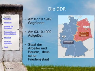 Das Dokument behandelt die Geschichte der DDR, einschließlich des Mauerbaus 1961, der Revolution von 1989 und der darauffolgenden Wiedervereinigung Deutschlands 1990. Es werden die politischen und sozialen Bedingungen in der DDR, die Rolle der oppositionellen Gruppen und die Bedeutung der Montagsdemonstrationen hervorgehoben. Der Mauerfall am 9. November 1989 markiert das Ende der Teilung und führt zur Einführung von marktwirtschaftlichen Prinzipien in der ehemaligen DDR.