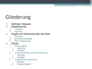 Die Präsentation behandelt verschiedene Arten von Malware, wie Trojaner, Würmer und Phishing, sowie deren Angriffs- und Verbreitungsmechanismen über das Web. Es werden auch Schutzmethoden wie Antivirensoftware, Heuristik, Sandboxes und präventive Maßnahmen wie das Verhindern von Drive-by-Downloads diskutiert. Ziel ist es, ein Bewusstsein für die Gefahren im Internet zu schaffen und effektive Schutzmaßnahmen zu empfehlen.