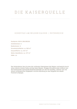 Das Dokument beschreibt ein exklusives Bergchalet in Scheffau, Österreich, zum Kaufpreis von 6.380.000 Euro, das über 5 Schlafzimmer, 4 Badezimmer und eine Grundstücksfläche von ca. 965 m² verfügt. Die Immobilie bietet einen unverbaubaren Ausblick auf den Hintersteiner See, einen Wellnessbereich mit Sauna und Dampfbad sowie eine moderne Profiküche. Zudem werden Informationen zu Nebenkosten beim Erwerb oder der Miete der Immobilie gegeben, einschließlich Provisionsgebühren und Rechtskosten.