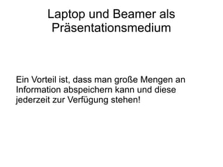 Der Beamer ist ein modernes und beliebtes Präsentationsmedium, das es ermöglicht, große Informationsmengen zu speichern und komplexe Inhalte zu visualisieren. Ein Nachteil ist jedoch, dass immer nur eine Darstellung gezeigt werden kann, was zu einem Memoryproblem führt und ein individuelles Tempo beim Verständnis nicht berücksichtigt. Dadurch können die Inhalte nicht durchgehend sichtbar gehalten werden.