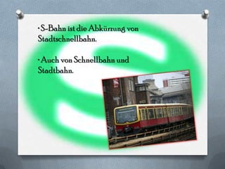 Die S-Bahn, kurz für Stadtschnellbahn, ist eine barrierefreie Eisenbahn, die durch städtische Gebiete mit einem Taktfahrplan verkehrt. Die Berliner S-Bahn wurde 1882 gegründet, begann 1924 mit der Elektrifizierung und erhielt 1930 das bekannte Logo eines weißen 'S' auf grünem Grund. Das Dokument enthält auch Grafiken des Liniennetzes und der Nutzung der S-Bahn in Berlin.