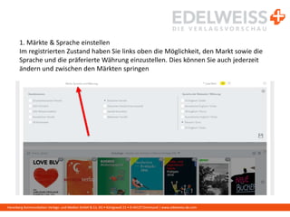 Das Dokument beschreibt die Funktionen und Einstellungen der Plattform edelweiss+, einschließlich der Anpassungsmöglichkeiten für Profile, Benachrichtigungen und die Verwaltung von Katalogen. Benutzer können Märkte und Sprachen auswählen, ihr Profil und die Community verwalten sowie Hilfe und Support kontaktieren. Zudem sind individuelle Anpassungen der Benutzeroberfläche und Boxen in der Anwendung möglich.