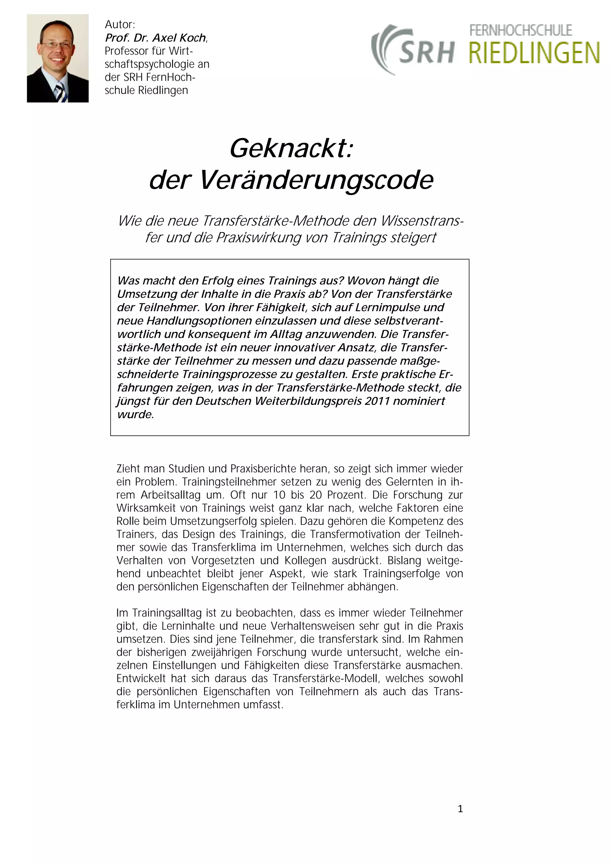Das Dokument beschreibt die Transferstärke-Methode, die von Prof. Dr. Axel Koch entwickelt wurde, um die Umsetzung von Trainingsinhalten in die Praxis zu verbessern. Die Methode bewertet die persönliche Transferstärke der Teilnehmer und analysiert, welche Einstellungen und Fähigkeiten berücksichtigt werden müssen, um den Erfolg von Trainings zu gewährleisten. Durch diese gezielte Anpassung der Trainingsprozesse an die individuelle Transferstärke sollen nachhaltige Veränderungen im Verhalten der Teilnehmer erreicht werden.