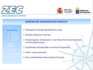 Die Kanarischen Inseln bieten durch die ZEC (Zona Especial Canaria) ein attraktives Niedrigsteuergebiet mit einer Körperschaftssteuer von nur 4% sowie hervorragenden Infrastruktur- und Lebensqualitätsindikatoren. Die ZEC fördert wirtschaftliche Aktivitäten, insbesondere durch Schaffung von Arbeitsplätzen und Investitionsanreize, während sie gleichzeitig ein hohes Maß an Rechtssicherheit und strategische Lage bietet. Durch die historischen Handelsbeziehungen und regelmäßige Verbindungen zu Westafrika und Lateinamerika wird das Gebiet als bedeutender globaler Geschäftsknotenpunkt positioniert.