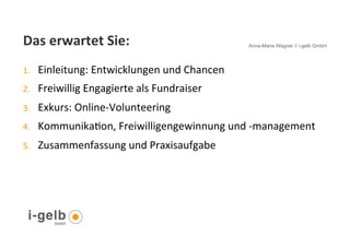 In einem Vortrag über die Gewinnung und Bindung von freiwilligen Helfern wird die Bedeutung des Online-Engagements für Fundraising und Freiwilligenarbeit hervorgehoben. Die Präsentation thematisiert die Nutzung des Internets durch Freiwillige, zukunftsorientierte Fundraising-Trends und die Notwendigkeit, die Bedürfnisse und Realitäten der engagierten Personen zu berücksichtigen. Erfolgreiches Freiwilligenmanagement erfordert eine klare Kommunikation und integrierte digitale sowie offline Aktionen.