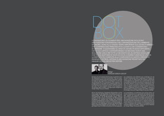 Das Dokument beschreibt dotbox, ein modulares Aufbewahrungssystem, das von Hangar Design Group für Dieffebi entworfen wurde und eine essentielle Rolle in der Organisation von modernen Arbeitsumgebungen spielt. Es bietet flexible Lösungen, um verschiedene Arbeitsbereiche zu gestalten und kann individuell an unterschiedliche Bedürfnisse angepasst werden. Dotbox zeichnet sich durch ansprechendes Design, robuste Materialien und zahlreiche Kombinationsmöglichkeiten aus.