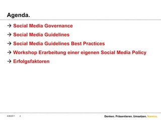 Das Dokument behandelt die Grundlagen der Social Media Governance und die Entwicklung einer eigenen Social Media Policy im Rahmen eines Workshops. Es werden Strategien und Erfolgsfaktoren für die Implementierung von Social Media in Unternehmen vorgestellt, sowie Verhaltensregeln für Mitarbeiter im Umgang mit sozialen Medien. Zudem wird die Notwendigkeit einer interdisziplinären Kommunikation und ein klarer Rollout der Richtlinien betont, um eine erfolgreiche Social Media-Kultur zu fördern.