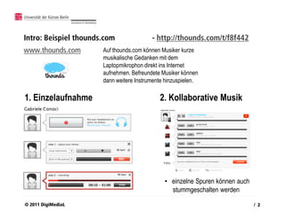 Das Dokument beschreibt einen Zertifikatskurs zu strategischem Musikmarketing im Internet für Musiker in Berlin und thematisiert die Entwicklung des Web 2.0 sowie dessen Einfluss auf die Musikindustrie. Es werden Grundlagen von Social Media, Trends in der Mediennutzung und die Bedeutung von interaktiven Plattformen wie Thounds.com vorgestellt, die kollaborative Musikprojekte ermöglichen. Zudem werden neue Begriffe und Mechanismen, die das Social Web prägen, erörtert.