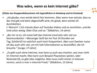 Das Dokument behandelt die Nutzung und Herausforderungen digitaler Medien, insbesondere die Rolle des Internets im Alltag von Jugendlichen und deren Kommunikationspraktiken. Es wird diskutiert, wie soziale Medien persönliche Öffentlichkeiten schaffen und die traditionelle Trennung zwischen Sender und Empfänger in der Massenkommunikation auflösen. Zudem werden die notwendigen Kompetenzen zur verantwortungsvollen Teilhabe und informationellen Selbstbestimmung hervorgehoben.