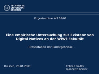 Die Untersuchung zeigt, dass es an der Wirtschaftswissenschaftlichen Fakultät der TU Dresden keine Digital Natives gibt, jedoch ca. 9% der Studierenden in diese Richtung tendieren. Der durchschnittliche Mediajahreswert der potenziellen Gruppe liegt bei 8,85 Jahren, was darauf hindeutet, dass diese Gruppe im Schnitt 1,2 Jahre früher mit digitalen Medien in Kontakt trat. Die Studie ergab, dass die Neigung zum Digital Native vom Studiengang abhängt, wobei Studierende der Wirtschaftsinformatik am stärksten tendieren.