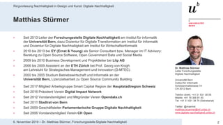 Dr. Matthias Stürmer leitet die Forschungsstelle für digitale Nachhaltigkeit an der Universität Bern und beschäftigt sich mit der Schnittstelle von Digitalisierung und Nachhaltigkeit. Die Ringvorlesung beleuchtet die Herausforderungen und Chancen der digitalen Transformation, einschließlich Auswirkungen auf Ressourcenverbrauch, Datenschutz und die Verantwortung der IT-Konzerne. Ein zentrales Ziel ist es, die digitale Nachhaltigkeit durch die Maximierung des Nutzens der Digitalisierung für gegenwärtige und zukünftige Generationen zu fördern.