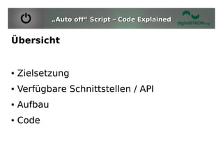 Das 'auto off' Skript automatisiert das Abschalten von Licht in einem konfigurierbaren Raum nach einer festgelegten Zeitspanne. Es kommuniziert über die digitale Strom-API und ermöglicht Nutzern die Konfiguration von Räumen und Zeitüberschreitungen über eine Weboberfläche. Das Skript verarbeitet Ereignisse, lädt und speichert Konfigurationen und schaltet das Licht basierend auf der zuletzt aufgerufenen Szene aus.
