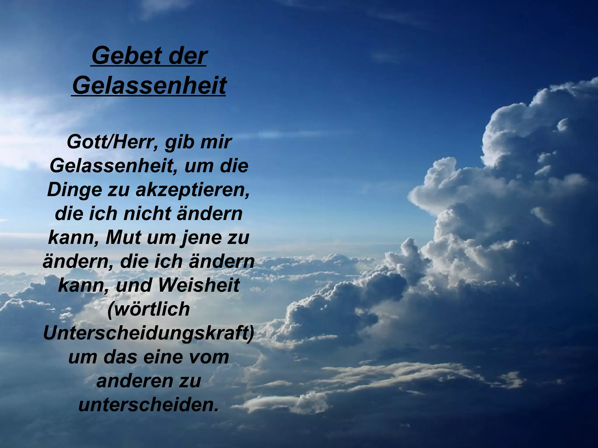 Das Gebet der Gelassenheit bittet Gott um die Gelassenheit, Dinge zu akzeptieren, die nicht änderbar sind, Mut zur Veränderung der Dinge, die man ändern kann, und Weisheit, um zwischen beidem zu unterscheiden. Es drückt den Wunsch aus, im Einklang mit Gottes Willen zu handeln und sich von Egoismus zu befreien.