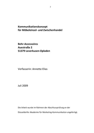 Das Dokument ist ein Kommunikationskonzept für den Möbel-Einzel- und Zwischenhandel, erstellt von Annette Elias im Juli 2009. Es analysiert verschiedene externe und interne Faktoren, definiert Zielgruppen und Kommunikationsstrategien, um neue Kunden und Geschäftspartner zu gewinnen und behandelt spezifische Maßnahmen, einschließlich Sonderaktionen und ein Budget von 8.000 Euro. Die Arbeit bezieht sich auf die Herausforderungen des Einzelhandels in einer strukturschwachen Lage und die Auswirkungen der Wirtschaftskrise auf das Kaufverhalten.