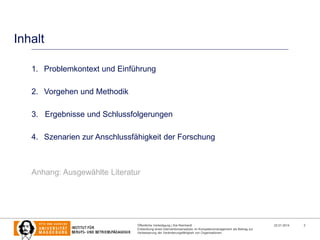 Das Dokument beschreibt die Entwicklung eines Interventionsansatzes im Kompetenzmanagement zur Verbesserung der Veränderungsfähigkeit von Organisationen, insbesondere im Kontext von Disruption und kontinuierlichem Wandel. Es werden verschiedene methodische Ansätze zur Analyse von Umweltfaktoren und deren Einfluss auf die Kompetenzen von Mitarbeitern und Organisationen diskutiert, wobei die Fähigkeit der Organisation, Umweltveränderungen zu antizipieren, als zentraler Erfolgsgarant identifiziert wird. Der Autor schließt mit Empfehlungen zur Etablierung von resilienten Kompetenzmanagement-Strategien und deren Verknüpfung mit organisationalen Veränderungen.
