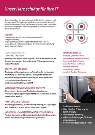 Ditpro definiert IT-Support mit einer 24/7-Überwachung, die Betriebsbereitschaft, Ereignisprotokolle, Speicherplatz und Microsoft-Dienste prüft. Bei Problemen werden die Administratoren umgehend alarmiert, wodurch eine schnelle Reaktion und Minimierung von Ausfällen möglich ist. Die Überwachung bietet präzise Warnungen und maximale Systemverfügbarkeit zu einem niedrigen monatlichen Beitrag ohne Vertragsbindung.