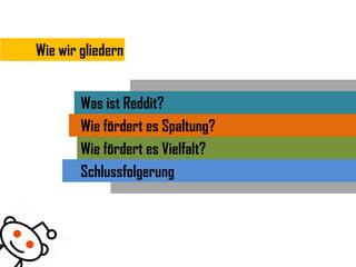 Das Dokument analysiert, wie Reddit als Social News Aggregator, der durch Nutzerinhalte und Bewertungen funktioniert, sowohl Spaltung als auch Vielfalt fördert. Während Reddit Spaltung durch Anonymität und unsachliche Argumentation begünstigt, ermöglicht es gleichzeitig den Austausch und die Selbstorganisation von Interessengruppen, was Vielfalt unterstützt. Insgesamt wird argumentiert, dass Reddit eher Vielfalt als Spaltung fördert, was zu einem Zusammenhalt unter den Nutzern führt.