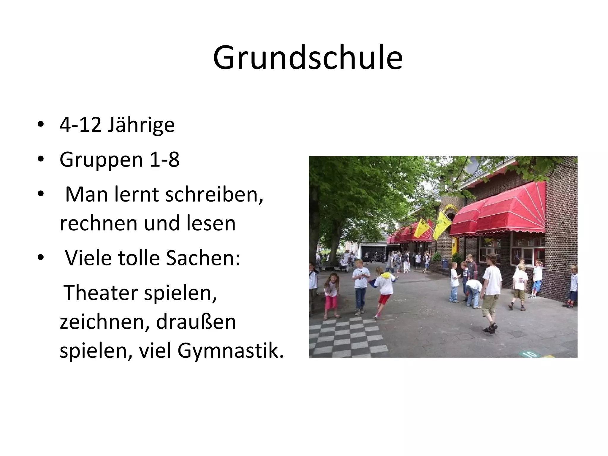 Das Dokument beschreibt die Schulbildung und Aktivitäten für 4- bis 12-Jährige, einschließlich Schreiben, Rechnen und Lesen, sowie Freizeitaktivitäten wie Theater und Sport. Nach der achten Klasse kann man verschiedene Schulformen wie VMBO, Havo oder VWO besuchen, wobei das Gymnasium besondere Fächer wie Latein oder Griechisch bietet. Außerdem werden Austauschprogramme und jährliche Theateraufführungen an der Schule erwähnt.