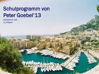 Das Dokument beschreibt ein Schulprogramm von Lisa Gorbatova aus der 11. Klasse, einschließlich Informationen über ihre Familie, Schule und geplante Aktivitäten in Frankreich und Deutschland. Es erwähnt ihren Vater Uwe, ihre Mutter Heike, und ihren Bruder Marcus sowie den Hund Jacky und die Katze Luna. Geplante Ausflüge umfassen Besuche in Monaco, Cannes, St. Tropez, Avignon und Nizza sowie Aktivitäten in Dresden.