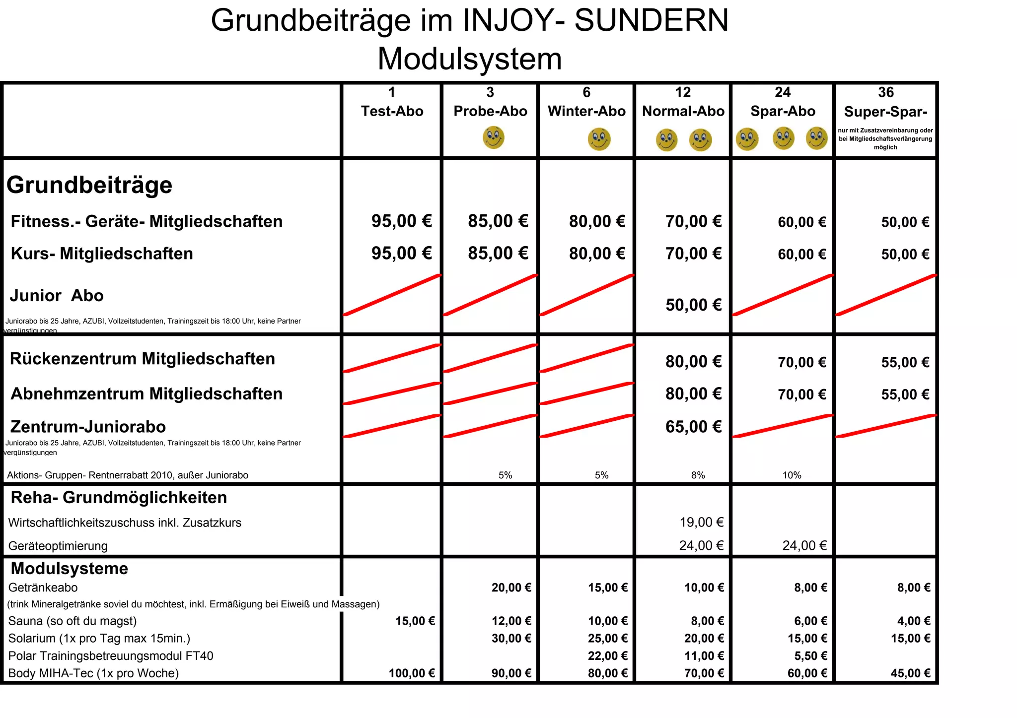 Das Dokument beschreibt die Mitgliedschaftsbeiträge und Abonnements im Injoy Sundern, einschließlich Preise für verschiedene Mitgliedschaften wie Fitness- und Kursmitgliedschaften sowie spezielle Angebote für Juniormitglieder. Zusätzlich werden verschiedene Dienstleistungen und Programme wie Trainingsbetreuung, Rückenzentrum, Ernährungsanalysen und Wellness-Angebote (Sauna, Solarium) aufgeführt. Es werden auch ermäßigte Preise für Senioren und Rabatte bei speziellen Mitgliedschaften angeboten.