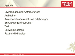 Der Praxisbericht behandelt die Erwartungen und Anforderungen an die Entwicklung moderner Business-Anwendungen mit Oracle-Technologien, insbesondere JDeveloper 11g und ADF. Wichtige Themen sind die Wahl der Architektur, der Umgang mit editierbaren Tabellen und die Bedeutung von Task Flows für die Benutzeroberfläche. Der Bericht betont die Notwendigkeit von Mentoring und Schulungen für Entwickler, um die komplexe ADF-Architektur effektiv zu nutzen.