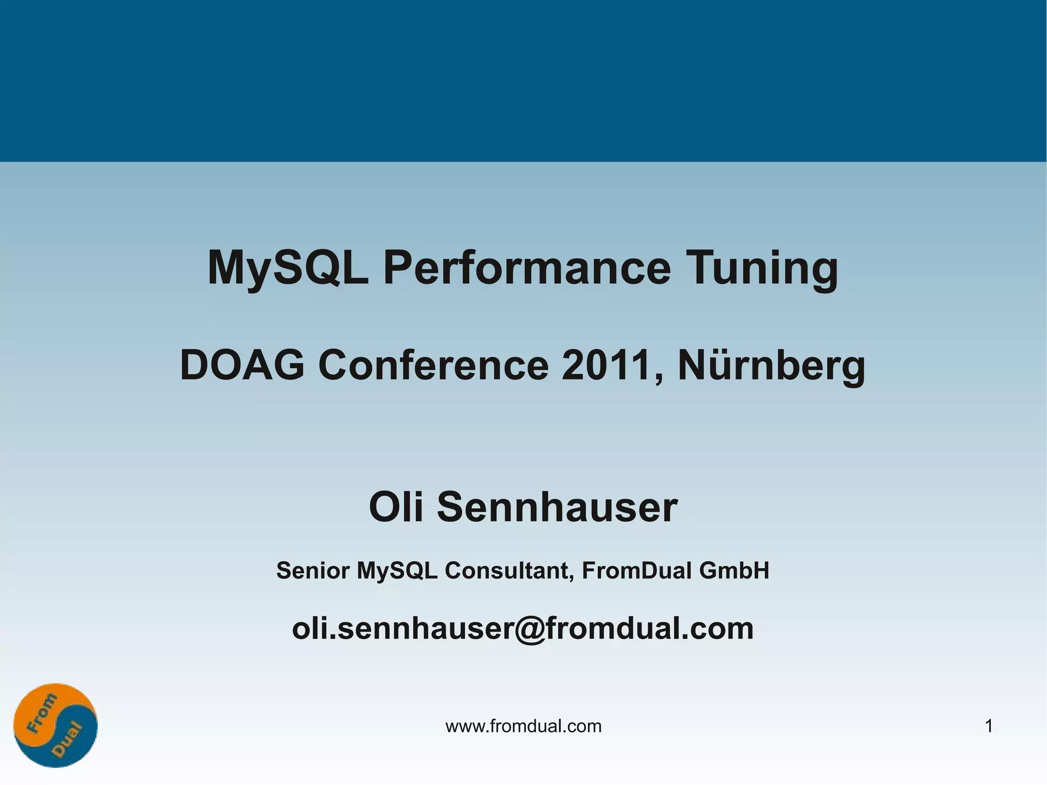 Die Präsentation von Oli Sennhauser auf der DOAG Konferenz 2011 behandelt die Optimierung der MySQL-Leistung und umfasst Themen wie das Identifizieren kritischer Ressourcen, das richtige Messen von Systemparametern und Techniken für das Tuning von Datenbanken. Der Vortrag betont die Bedeutung eines systematischen Ansatzes beim Performance Tuning, die Notwendigkeit von Benchmarks und das gezielte Anpassen von Datenbankparametern. Abschließend werden verschiedene Strategien zur Architektur und zum Design von MySQL-Systemen vorgestellt, um Engpässe zu vermeiden und die Effizienz zu steigern.