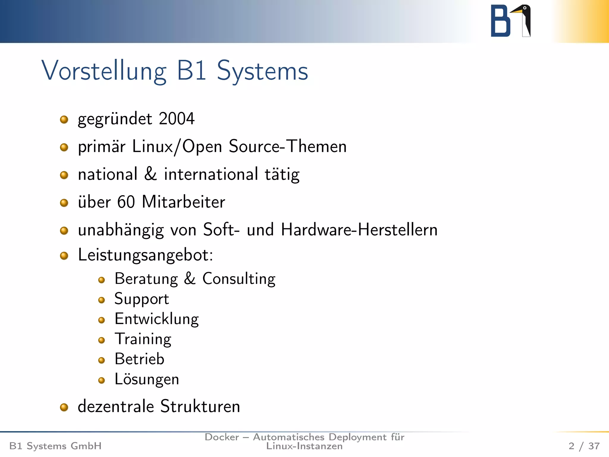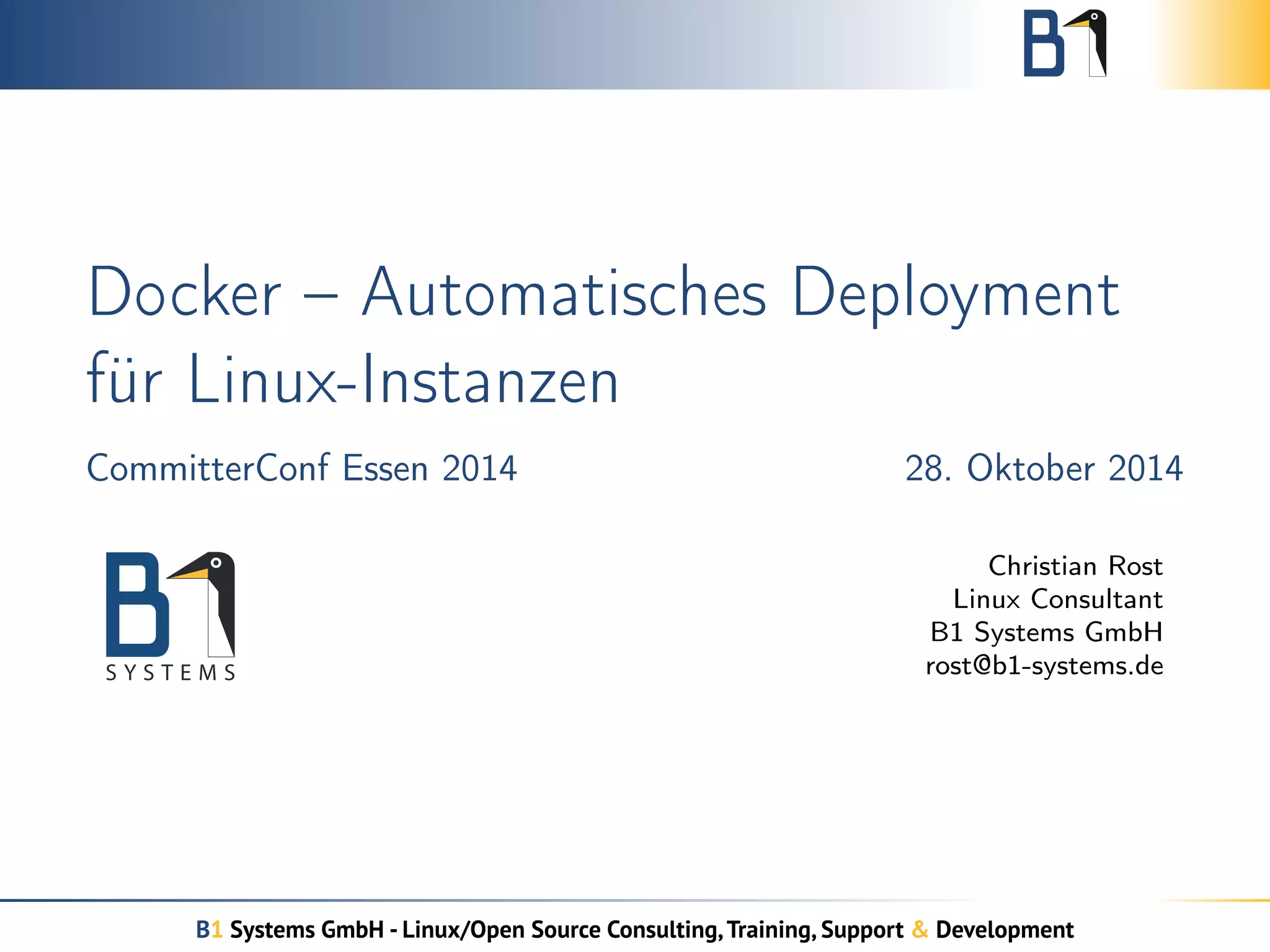 Das Dokument beschreibt Docker, eine Open-Source-Plattform für das Erstellen, Bereitstellen und Ausführen von Linux-Anwendungen in Containern, die eine standardisierte Prozessumgebung schaffen. Es werden die Vorteile und Einsatzmöglichkeiten von Docker erläutert, darunter automatisiertes Deployment, erhöhte Ausfallsicherheit und die Unterscheidung zwischen Containern und virtuellen Maschinen. Außerdem werden technische Details, die Docker-Architektur sowie Beispiele für Docker-Befehle und -Konfigurationen vorgestellt.