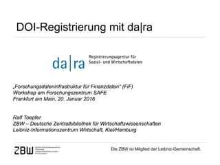 Die ZBW ist Mitglied der Leibniz-Gemeinschaft und bietet über die DOI-Registrierungsagentur einen Service zur dauerhaften und verlässlichen Zitierbarkeit von Forschungsdaten im Bereich der Sozial- und Wirtschaftswissenschaften an. Der Workshop behandelt Herausforderungen wie Versionierung, Granularität und Metadatenqualität bei der DOI-Registrierung und zielt darauf ab, eine hohe Datenqualität und Sichtbarkeit in internationalen Portalen zu gewährleisten. Zudem wird das DFG-Projekt Da|ra Searchnet vorgestellt, das eine zentrale Infrastruktur für Sozial- und Wirtschaftsdaten entwickeln soll.