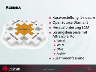 Das Dokument stellt die IT-Novum GmbH als Anbieter von Open-Source-Einheitslösungen im Bereich Enterprise Content Management (ECM) vor, insbesondere mit einem Fokus auf die Software Alfresco, die den kommerziellen Lösungen überlegen sein soll. Es beschreibt Herausforderungen im ECM, Lösungen zur Informationsverfügbarkeit und den Austausch zwischen verschiedenen Anwendungen zur Effizienzsteigerung. Des Weiteren werden spezifische Anwendungsszenarien und die Vorteile von Alfresco gegenüber kommerziellen Softwarelösungen erläutert.