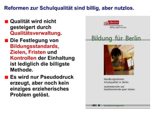 Reformen zur Schulqualität, wie die Einführung von Qualitätsmanagement und Evaluation, sind ineffektiv und verschleudern wertvolle Zeit der Lehrkräfte, anstatt die Unterrichtsqualität zu verbessern. Der Druck von oben und das Aufblähen bürokratischer Strukturen schaffen Hindernisse für eine individuelle Förderung der Schüler. Es ist notwendig, mehr Zeit für die direkte Interaktion mit Schülern zu schaffen, anstatt sich in nutzlosen administrativen Prozessen zu verlieren.