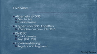 Das Dokument behandelt die Sicherheitsmerkmale des Domain Name System (DNS) und die Entwicklung der DNS-Sicherheitserweiterungen (DNSSEC), die seit ihrer ersten Implementierung im Jahr 1999 kontinuierlich gewachsen ist. Es wird auf die Funktionsweise von DNS und verschiedene Angriffstypen eingehen, einschließlich DNS-Caching-Überflutung, und die Rolle von Schlüsselparametern wie dem Zone Signing Key (ZSK) und dem Key Signing Key (KSK) betrachtet. Außerdem werden Implementierungsdetails für Registrare und Registranten erläutert, um die Sicherheit der DNS-Einträge zu gewährleisten.