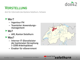 Das Dokument beschreibt die Rolle des Amts für Informatik des Kantons Solothurn als internen IT-Dienstleister mit dem Ziel, zeitnahe und kostengünstige IT-Lösungen für die kantonale Verwaltung zu ermöglichen. Es werden Beispiele produktiver Anwendungen wie die medienbruchfreie Bestellung des Fischereipatents und ein spezialisiertes elektronisches Antragswesen angegeben, die beide ohne manuellen Eingriff funktionieren. Zusätzlich wird auf die Offenheit der Lösungen hingewiesen, die es ermöglichen, beliebige Datenquellen anzubinden.