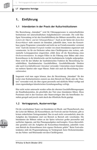 Das Dokument behandelt die verschiedenen Vertragsgestaltungen für Intendanten in kulturellen Institutionen, wobei es auf deren Rollen, Aufgaben und die Vielfalt der Vertragsarten eingeht. Es wird aufgezeigt, dass es keinen einheitlichen Vertragsstandard gibt, insbesondere im Bereich von Bühnen, Konzertsälen und Festivals, und dass der Intendantenmustervertrag des Deutschen Bühnenvereins häufig als Grundlage für Vertragsverhandlungen dient. Zudem wird die rechtliche Natur dieser Verträge als Dienstverträge beschrieben, die spezifische Aufgaben und Verantwortlichkeiten der Intendanten regeln.