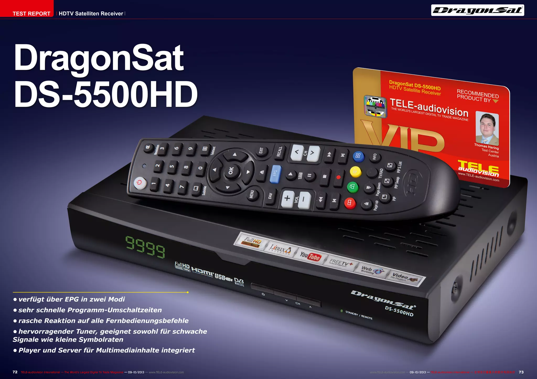Der Dragonsat DS-5500HD ist ein kompakter, hochwertiger HDTV-Satellitenreceiver mit umfassenden Funktionen, einschließlich schneller Umschaltzeiten, integrierter Mediaplayer- und Server-Funktionalität sowie Unterstützung für Full HD. Er bietet einfache Benutzeroberflächen zur Kanalsuche und -verwaltung, ermöglicht die Verbindung zu externen Speichern und hat mehrere Konnektivitätsoptionen, einschließlich HDMI und USB. Die Benutzerfreundlichkeit wird durch eine gut strukturierte Menüführung und zahlreiche Personalisierungsoptionen ergänzt.