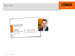 Das Dokument beschreibt die strategischen Ansätze der Coinor AG zur Verbesserung von Geschäftsprozessen für Finanzdienstleister in Deutschland durch die Implementierung flexibler Anwendungen und technischer Konzepte. Der Fokus liegt auf der Reduktion des Aufwands in der Softwareentwicklung durch die Verwendung eines stabilen Anwendungskerns und einer domänenspezifischen Sprache. Die Ideen zielen darauf ab, den Übersetzungsprozess zwischen fachlichen Anforderungen und technischen Lösungen zu optimieren.