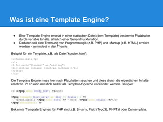 Das Dokument diskutiert die Twig Template Engine für Drupal, die eine moderne und flexible Alternative zur traditionellen PHP-Template-Engine darstellt. Es wird die Trennung von Programmlogik und Markup hervorgehoben, sowie die Vorteile von Twig, wie Sicherheit und einfache Syntax. Zudem werden Best Practices für Entwickler und Gestalter vorgestellt, um die Integration von Twig in Drupal zu erleichtern.