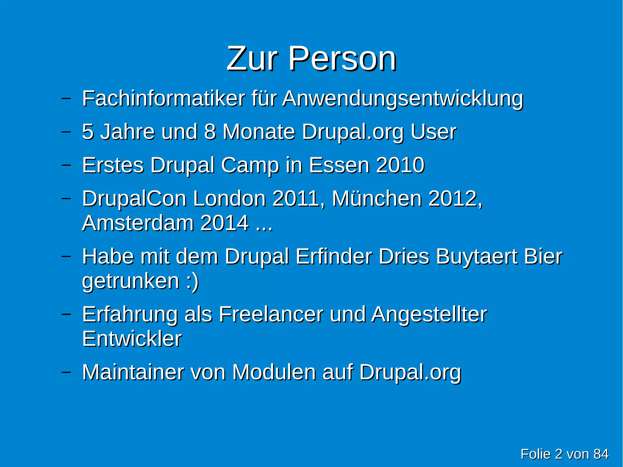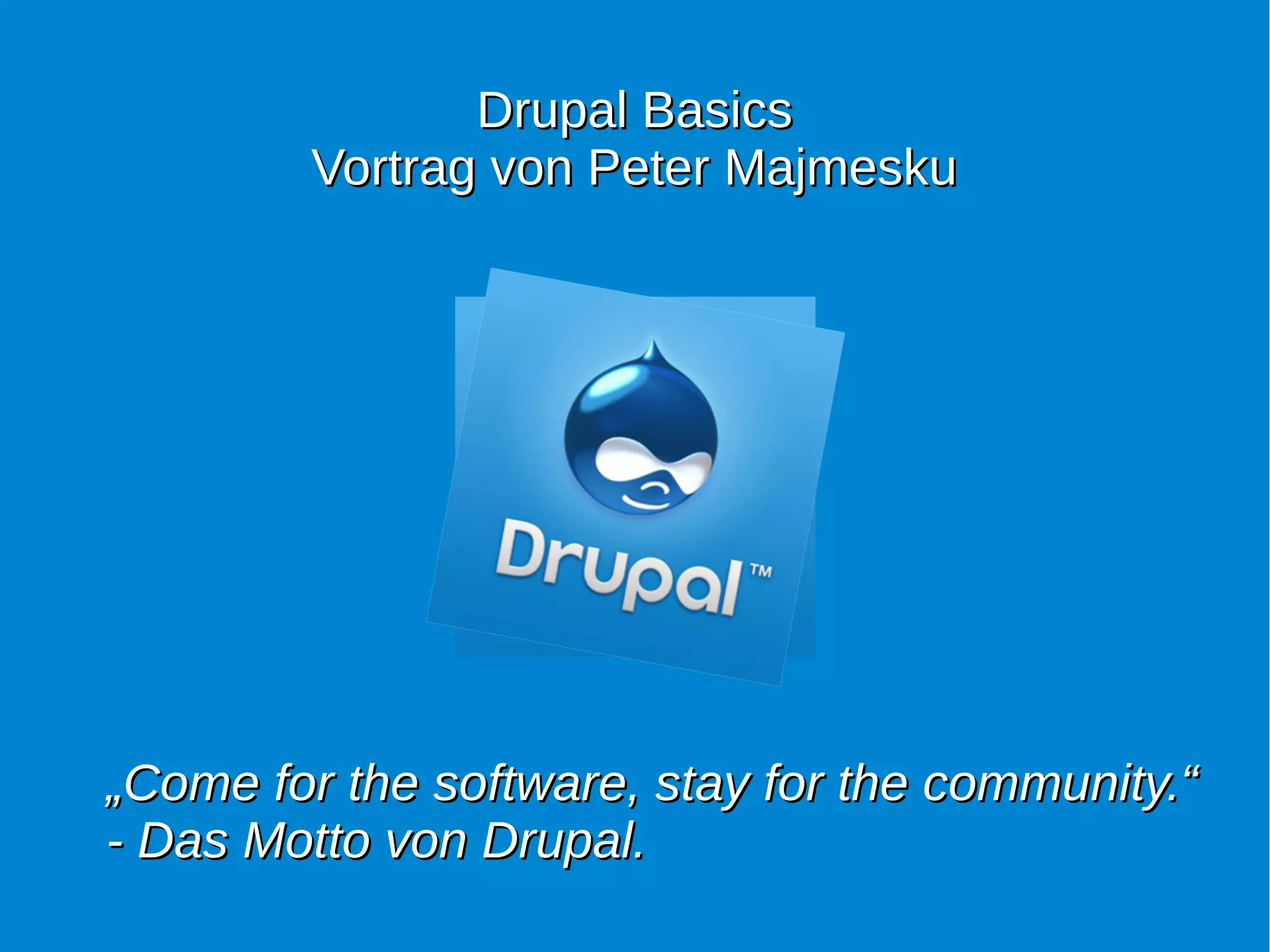 Peter Majmesku präsentiert die Grundlagen von Drupal, einem Content Management System, das sich gut als Community-Plattform eignet und seit seiner Erstveröffentlichung im Jahr 2001 eine große Nutzerbasis aufgebaut hat. Der Vortrag umfasst Themen wie Installation, Inhaltsstruktur, Backend und Frontend sowie Tipps zur Benutzerverwaltung und zur Umsetzung von Modulen. Drupal wird als qualitativ hochwertiger und erweiterbarer als andere CMS wie WordPress dargestellt, mit einer starken Community und vielfältigen Funktionen.