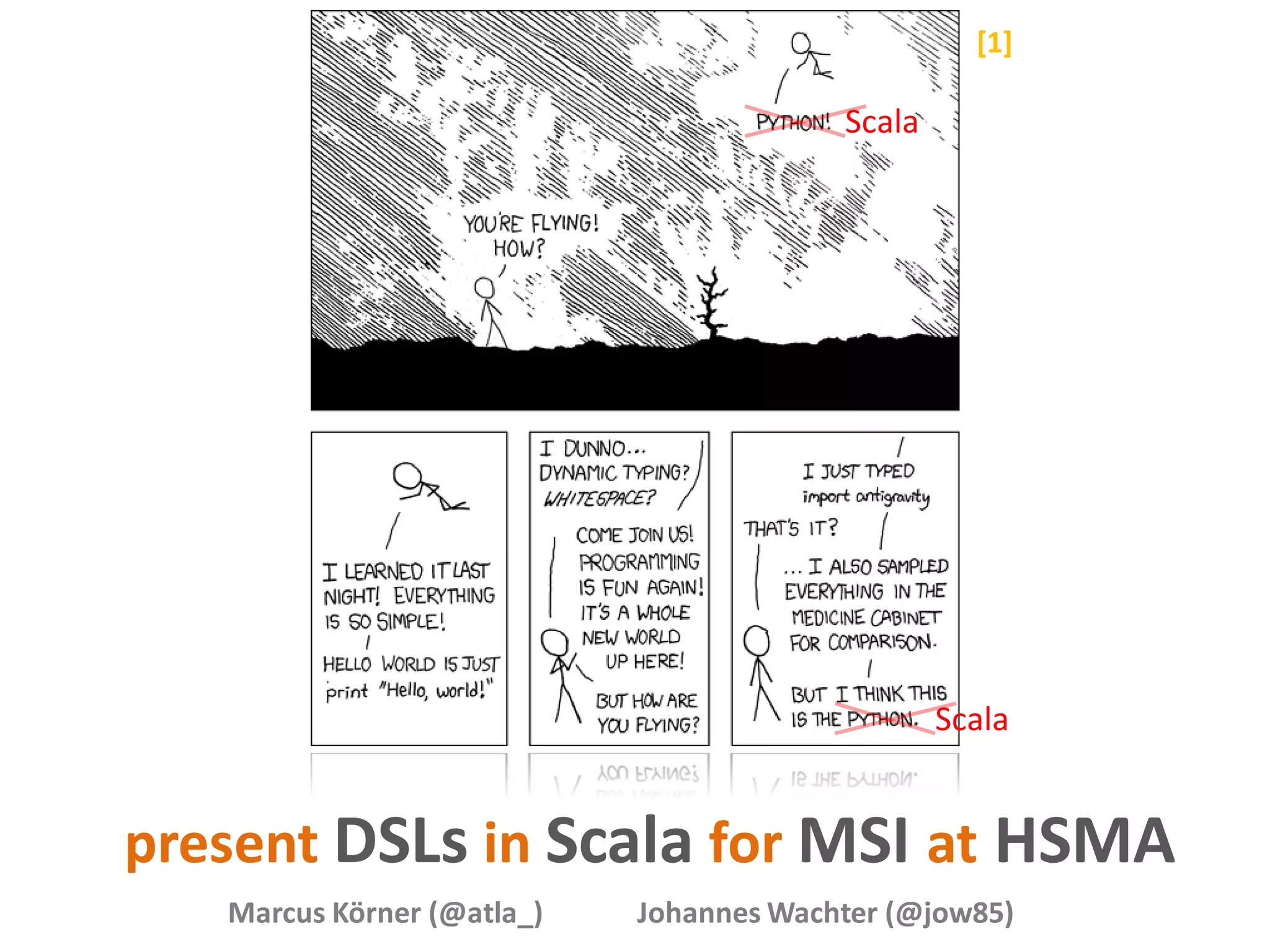 Das Dokument behandelt Domain Specific Languages (DSLs) in Scala und erklärt deren Definition, Nutzung und Vorteile. Es werden verschiedene Beispiele für DSLs präsentiert, einschließlich Anwendungen in der Finanzwelt und für Bestellungen bei Starbucks, sowie technische Details zur Implementierung und der Integration in bestehende Programmiersprachen. Der Vortrag zielt darauf ab, die Lesbarkeit und Effizienz in der Softwareentwicklung durch den Einsatz von DSLs zu verbessern.