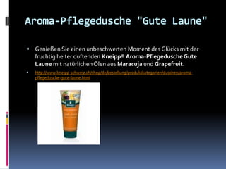 Das Dokument beschreibt verschiedene Produkte der Kneipp Aroma-Pflegeduschen, einschließlich der Varianten "gute Laune" mit Duftnoten von Maracuja und Grapefruit sowie "lebensfreude", die aktivierend wirkt. Zudem wird die Cremeredusche Jasmin & Arganöl hervorgehoben, die Entspannung bietet, sowie ein Dusch- und Shampoo-Produkt für Männer. Kontaktinformationen und Links zu den Produkten auf der Kneipp-Website sind ebenfalls enthalten.