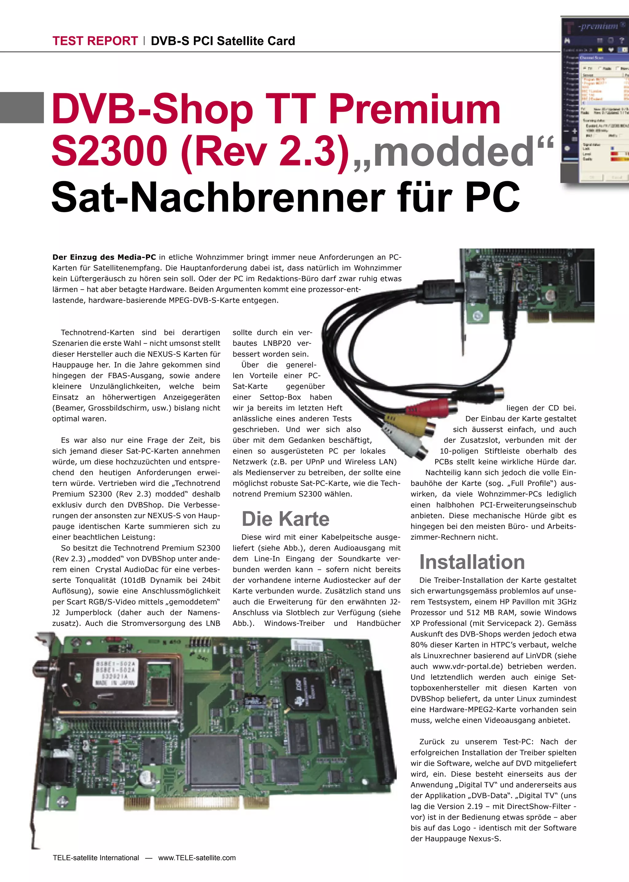 Der Testbericht zur Technotrend Premium S2300 (Rev 2.3) 'modded' DVB-S PCI-Satellitenkarte hebt ihre Vorteile für Multimedia-PCs hervor, insbesondere in Bezug auf nahezu lautlosen Betrieb und hervorragende Bildqualität. Die Installation der Karte gestaltet sich als einfach, und die Software unterstützt verschiedene Audio- und Videoformate sowie Funktionen wie Timeshift und EPG, weist jedoch in der Bedienung einige Mängel auf. Die Karte ist sowohl für Linux- als auch Windows-Betriebssysteme geeignet und besonders in HTPCs sowie als Media-Server für Internetdienstleistungen gefragt.