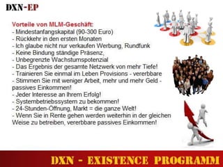 Das Dokument beschreibt ein Netzwerk-Marketing-Programm von DXN, das eine Möglichkeit bietet, von zu Hause aus passives Einkommen zu erzielen, während man gleichzeitig die eigene Gesundheit und Lebensqualität verbessert. Es hebt die Vorteile des Verkaufs von Gesundheitsprodukten, insbesondere von Ganoderma-Kaffee, hervor und ermutigt Menschen, ein eigenes Geschäft mit minimalem Risiko zu starten. Die Präsentation stellt dar, dass jeder die Chance hat, ein finanziell unabhängiges Leben zu führen, ohne große Investitionen und Risiken eingehen zu müssen.