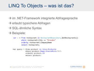 Das Dokument erklärt die LINQ to Objects-Technologie im .NET-Framework, die typsichere Abfragen mit einer SQL-ähnlichen Syntax ermöglicht und über Extension-Methoden funktioniert. Es wird auf den dynamischen Filterungs- und Sortierungsansatz eingegangen, der es Anwendern erlaubt, Attribute im User Interface zu definieren und die Ergebnisse in einem Grid zu visualisieren. Zudem werden zukünftige Veranstaltungen im Bereich Softwareentwicklung angekündigt.