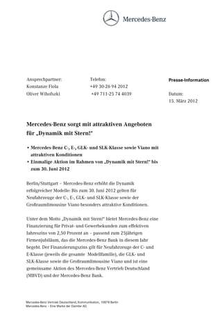 Mercedes-Benz bietet im Rahmen der Aktion 'Dynamik mit Stern!' bis zum 30. Juni 2012 attraktive Finanzierungsangebote für Neufahrzeuge der C-, E-, GLK- und SLK-Klasse sowie den Viano zu einem effektiven Jahreszins von 2,50 Prozent an. Diese Aktion feiert zudem das 25-jährige Jubiläum der Mercedes-Benz Bank. Der Vertrieb Deutschlands wird von rund 1.130 Mercedes-Benz Standorten und weiteren Servicestützpunkten unterstützt.