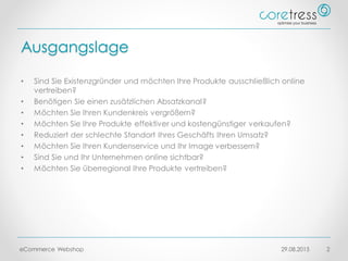 Coretress bietet maßgeschneiderte Lösungen für Existenzgründer und Unternehmen, die einen Online-Shop gründen oder ihren bestehenden Shop verbessern möchten. Vorteile des E-Commerce umfassen 24/7-Verfügbarkeit, weltweite Reichweite und Kosteneinsparungen. Die Firma unterstützt bei der Analyse der Bedürfnisse, der Einrichtung des Shops und der Anpassung an individuelle Anforderungen mit einer Vielzahl von Programmiermodulen.